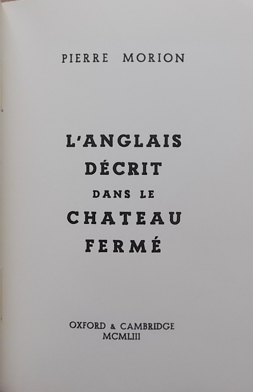 MORION (Pierre) [pseudo. d’André Pieyre de Mandiargues] L’anglais décrit dans le château fermé. Oxford et Cambridge, sans nom, 1953. [Sceaux, Jean-Jacques Pauvert, 1953].
