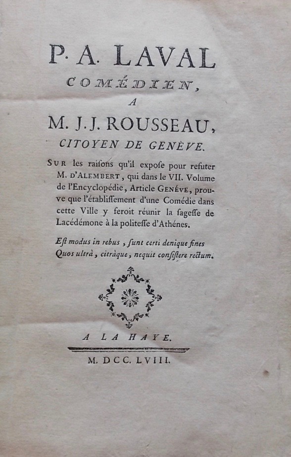 NOLIVOS DE SAINT-CYR (Paul Antoine) [LAVAL] A M. J. J. Rousseau, citoyen de Genève. Sur les raisons qu’il expose pour refuter M. D’Alembert, qui dans le VII. Volume de l’Encyclopedie, Article Genève, Prouve que l’établissement d’une Comédie dans cette Ville y feroit réunir la sagesse de Lacédémone à la politesse d’Athénes. La Haye, sans nom, 1758.