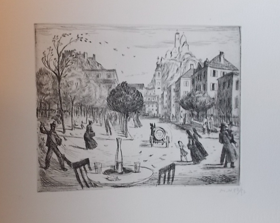 Edition limitée à 100 exemplaires sur pur chiffon Johannot (les 10 premiers accompagnés d’une suite sur Chine). Cartable contenant 27 eaux-fortes originales (dont table et justification) de Marcel North signées et justifiées au crayon par l’artiste. Contient donc une vue des villes suivantes: Altdorf, Stans, Schwytz, Lucerne, Sarnen, Zurich, Zoug, Glaris, Aarau, Berne, Soleure, Frauenfeld, Appenzell, Fribourg, Lausanne, Bâle, Hérisau, Schaffhouse, Bellinzone, Genève, St-Gall, Liestal, Coire, Sion, et Neuchâtel. Le recto de la première page (sommaire) et le verso de la dernière (justification) sont jaunis à cause du contact avec le cartable, comme pour tous les exemplaires vus à ce jour. Sinon en parfaite condition.