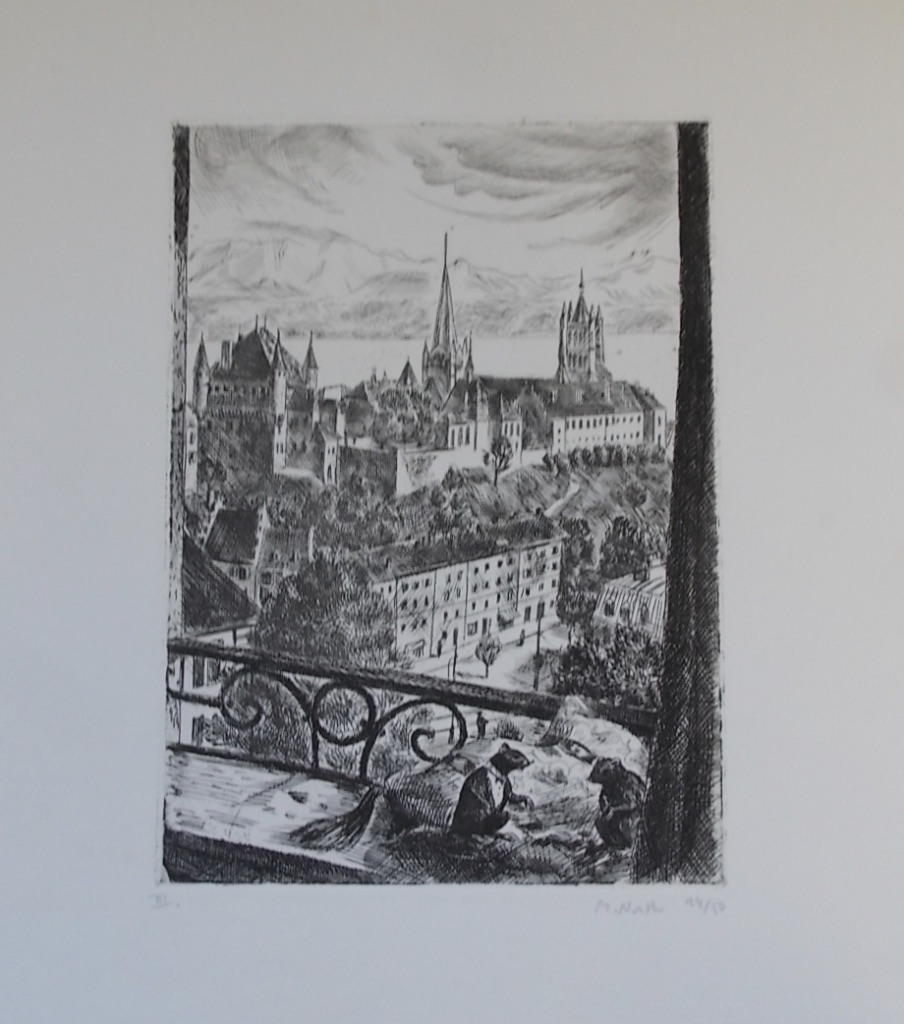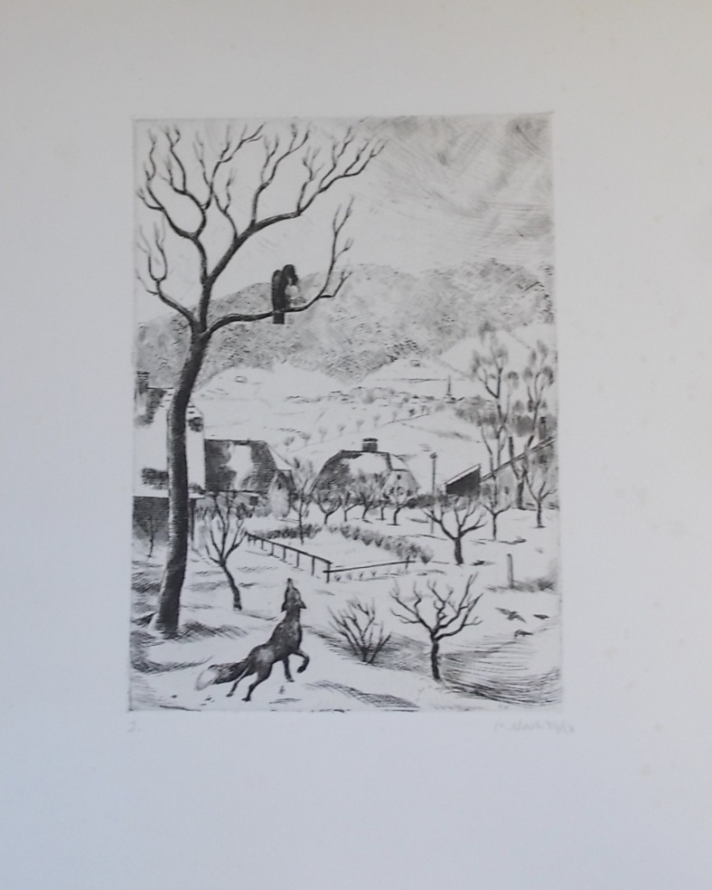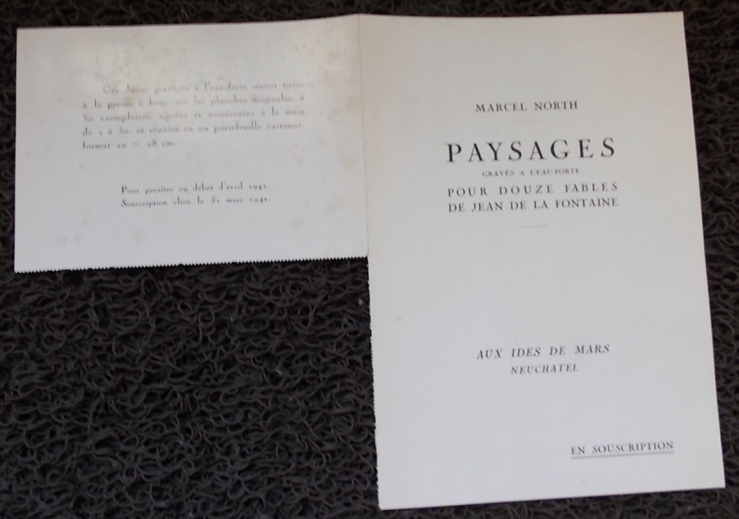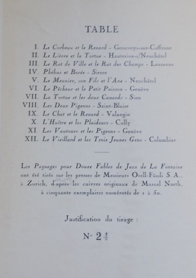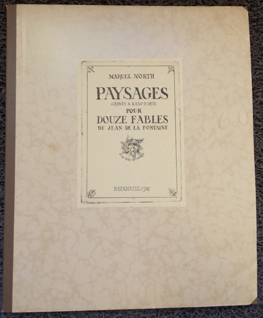 Portefeuille contenant 12 eaux-fortes originales tirées à 50 exemplaires (toutes signées et justifiées de la main de l’artiste). Amusante réalisation qui replace les 12 fables choisies de La Fontaine dans des paysages de Suisse romande. Premier ouvrage édité par Fred Uhler, le seul sous le nom des Ides de Mars qui deviendront les éditions Ides et Calendes. On joint le bulletin de souscription (sans la partie commande, visiblement utilisée) sur lequel on annonce un tirage de 30 exemplaires. Sans doute connut-il un succès inattendu dès sa souscription. Le portefolio le plus recherché de Marcel North.