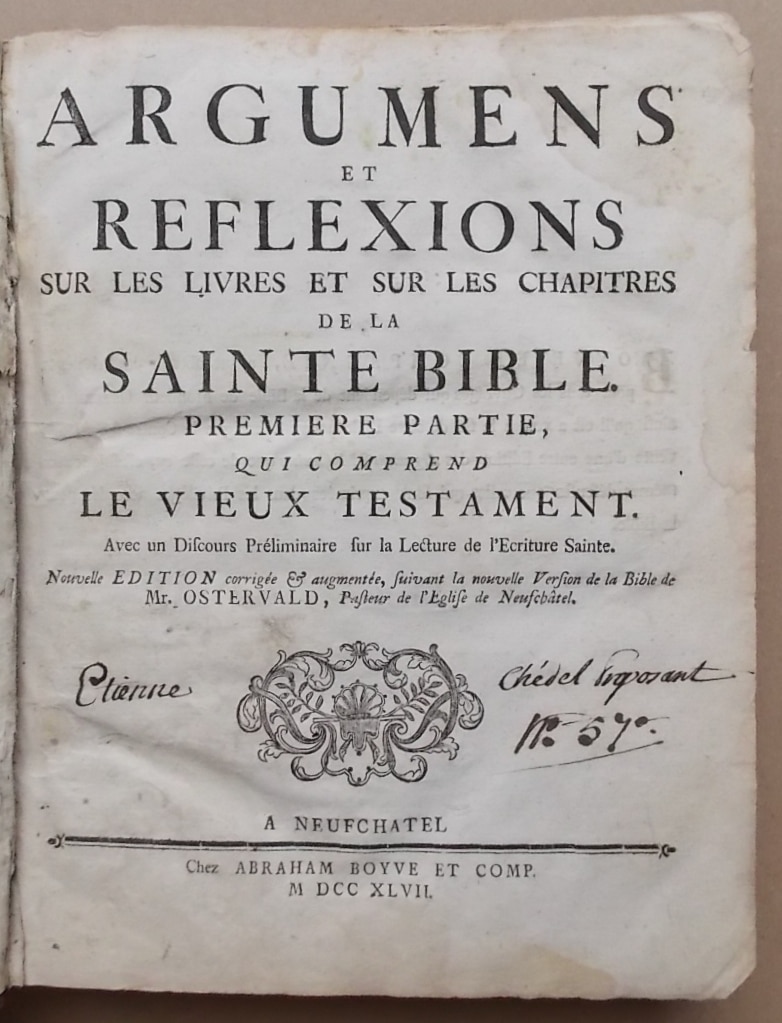OSTERVALD (Jean-Frédéric) Argumens et reflexions sur les livres et sur les chapitres de la Sainte Bible. A Neufchastel, chez Abraham Boyve et Comp., 1747.