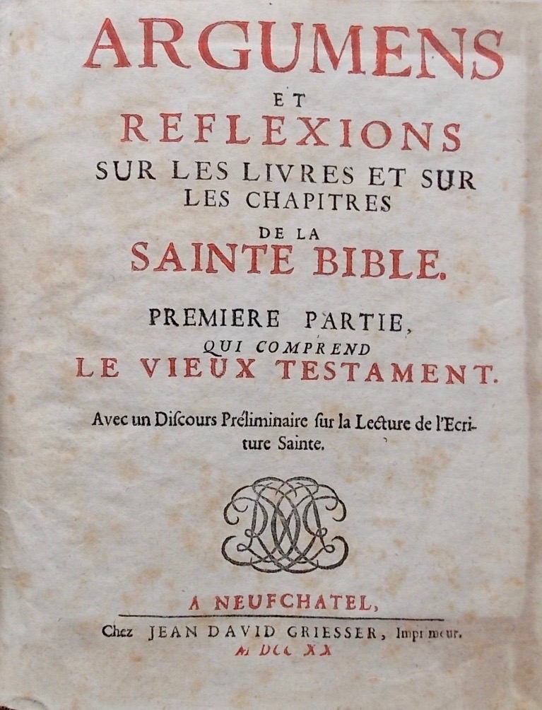 OSTERVALD (Jean-Frédéric) Argumens et reflexions sur les livres et sur les chapitres de la Sainte Bible. A Neufchatel [Neuchâtel], chez Jean David Griesser, 1720.
