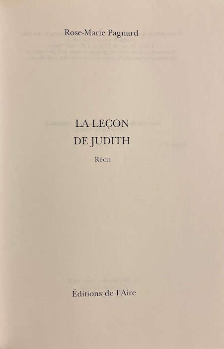 PAGNARD (Rose-Marie) La leçon de Judith. Récit. Lausanne, Editions de l’Aire, 1993.