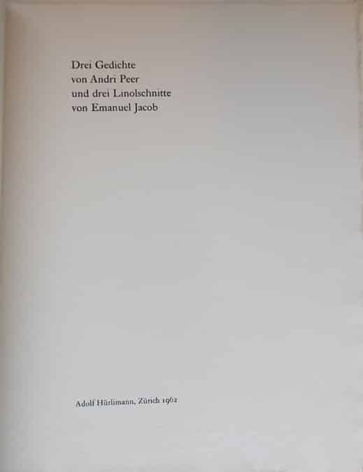 PEER (Andri) & JACOB (Emanuel) Drei Gedichte von Andri Peer und drei Linolschnitte von Emanuel Jacob. Zürich, Adolf Hürlimann, 1962.