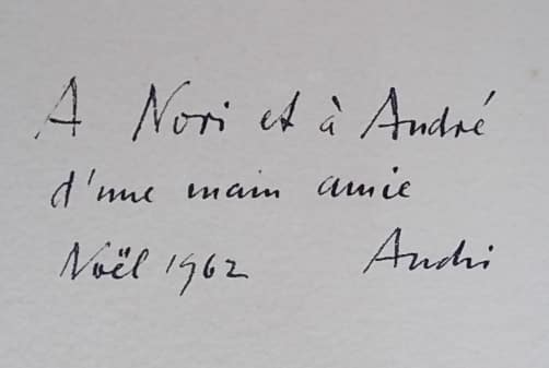 Privatdruck für die Freunde der Herausgeber in 54 numerierten Exemplaren auf handgeschöpftem, getönten Richard de Bas, grain moyen. Mit 3 (2 ganzseit.) Farblinolschnitten von Emanuel jacob. Druckvermerk vom Autor, Künstler und Drucker signiert. Erstes weisses Blatt mit handschriftlicher Widmung A Nori et à André, d’une main amie / Noël 1962 / Andri. In perfekt Zustand.