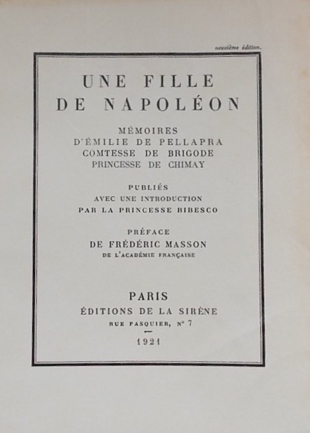 PELLAPRA (Emilie de, comtesse de Brigode, princesse de Chimay) Une fille de Napoléon. Mémoires. Paris, La Sirène, 1921.