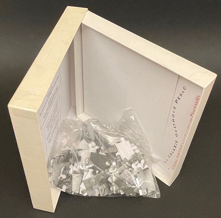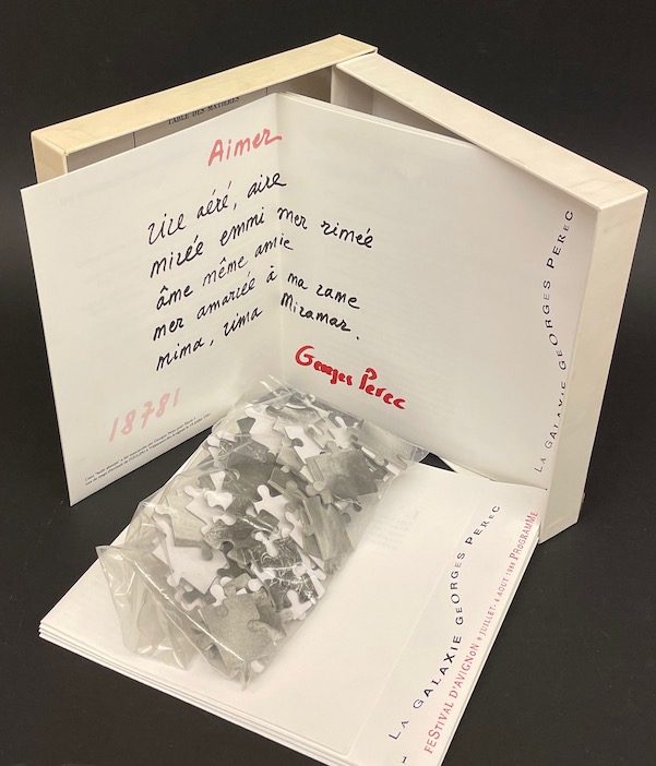 Très joli coffret d’hommage à Georges Perec édité lors du Festival d’Avignon de 1988. Tirage limité et numéroté, mais non précisé (celui-ci exemplaire n° 589). Contient un puzzle de 99 pièces (complet) sous sachet plastique et 4 feuillets dépliants (1. La galaxie Georges Perec, festival d’Avignon 1988, programme / 2. Puzzle pour un portrait de Georges Perec, exposition en 99 éléments / 3. Bio-biblio-filmographie de Georges Perec / 4. A la mémoire de Georges Perec, textes des membres de l’Oulipo). En parfaite condition.