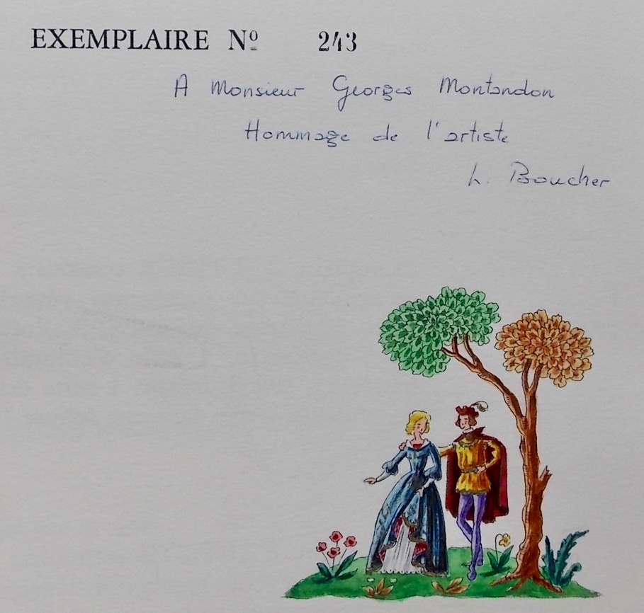 Edition de luxe ornée de nombreuses illustrations coloriées et dorées par Lucy Boucher dans le style des enluminures du Moyen-Âge (mise en couleurs par des procédés artistiques, artisanaux et manuels de coloriage). Tirage limité. Edition limitée à 2500 exemplaires numérotés sur vélin B.F.K. Ces 2 volumes font partie des 390 exemplaires contenant une suite en couleurs. Enrichi d’un envoi autographe signé accompagné d’un petit dessin original de l’illustratrice à la page de justification. Bords des étuis légèrement frottés, sinon très bel exemplaire.