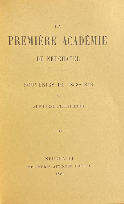 PETITPIERRE (Alphonse) La première Académie de Neuchâtel. Souvenirs de 1838 – 1848. Neuchâtel, Attinger Frères, 1889.