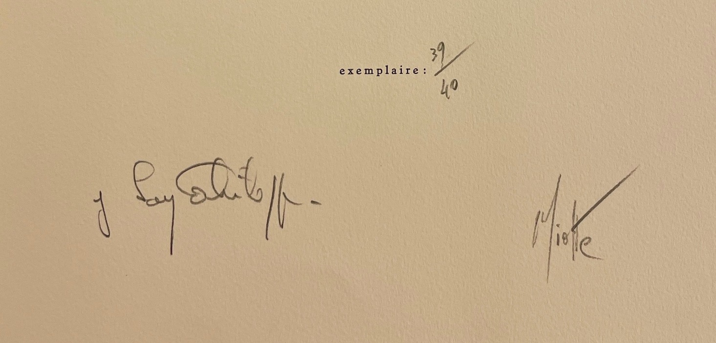 Edition originale numérotée 1/40 exemplaires vélin d’Arches (seul tirage avec 5 exemplaires hors commerce sur le même papier). Illustré de 5 gravures originales en couleurs de Jean Miotte. Signé par l’auteur et par l’artiste à la justification.