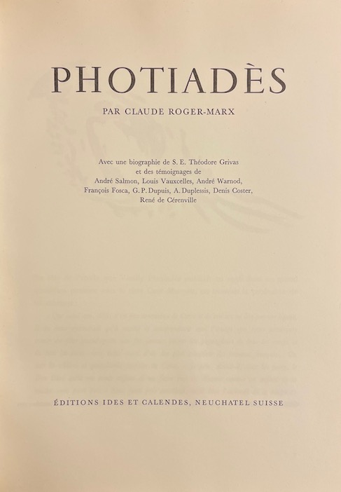[PHOTIADES] – ROGER-MARX (Claude) Vassily Photiadès. Neuchâtel, Ides et Calendes (coll. Grandes Monographies), (1966).