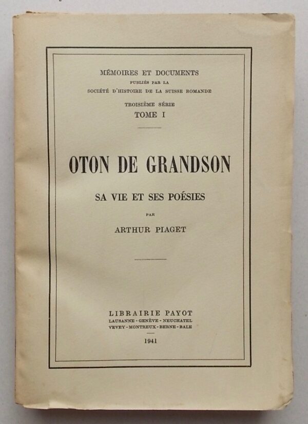 PIAGET (Arthur) Oton de Grandson. Sa vie et ses poésies, Lausanne, Payot (« MEMOIRES ET DOCUMENTS publiés par la Société d’histoire de la Suisse romande. Troisième série. Tome I ») , 1941.