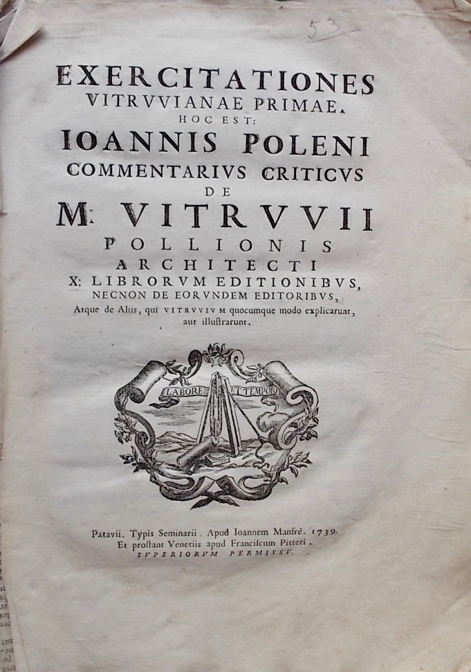 POLENI (Giovanni) Exercitationes Vitruvianae Primae. Hoc est: Ioannis Poleni commentarius criticus de M. Vitruvii Pollonis architecti X Librorum editionibus . Exercitationes Vitruvianae Secundae. . Tertiae Patavii, Typis Seminarii, Apud Ionnem Manfrè, 1739.
