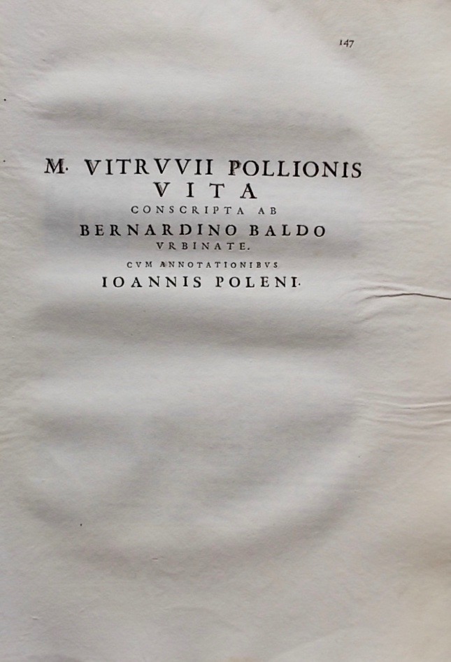 Travail préparatoire pour l’édition inachevée de Vitruve par Poleni, qui est néanmoins la première étude scientifique d’un texte architectural publié après la grande saison de la renaissance… un examen de l’histoire de l’édition de Vitruve, à partir de l’editio princeps de Giovanni Sulpizio en 1486 (Millard). Contient la correspondance de Poleni avec Giovanni Battista Morgagni, et la réimpression de la vie de Vitruve de Bernardino Baldi, publiée pour la première fois en 1612.
