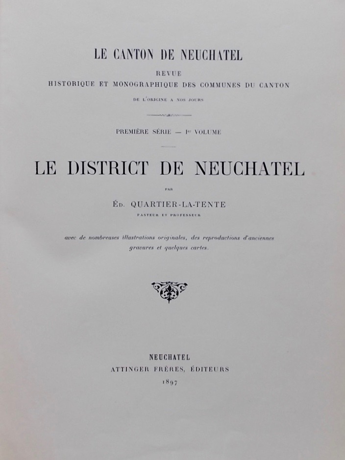 QUARTIER-LA-TENTE (Edouard) Le canton de Neuchâtel. Revue historique et monographique des communes du canton. Première série (1er – 2e – 3e volume): District de Neuchâtel. Neuchâtel, Attinger Frères, 1897-1903.