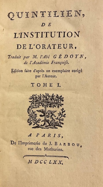 QUINTILIEN De l’institution de l’orateur. Paris, J. Barbou, 1770.