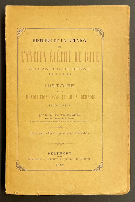 QUIQUEREZ (Dr. Auguste) Histoire de la réunion de l’ancien Evèché de Bâle au canton de Berne (1813 à 1818) – Histoire de la révolution dans le Jura bernois (1830 à 1831). Delémont, Imprimerie J. Béochat – Société Jurassienne d’Emulation, 1882.