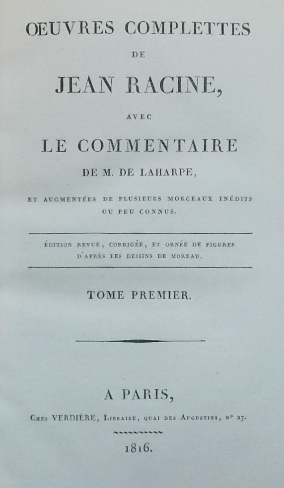 RACINE (Jean) Oeuvres complettes de Jean Racine, avec le commentaire de M. de Laharpe. A Paris, chez Verdière, 1816.