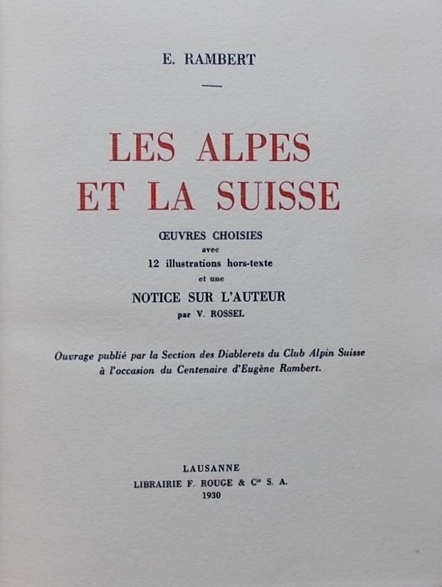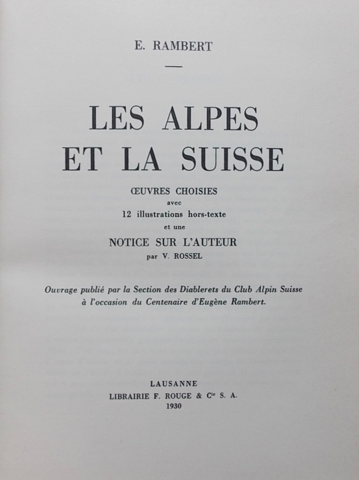 Avec 12 illustrations hors texte et une notice sur l’auteur par V. Rossel. Ouvrage publié par la section des Diablerets du Club Alpin Suisse à l’occasion du centenaire d’Eugène Rambert. Inscription en page de garde.