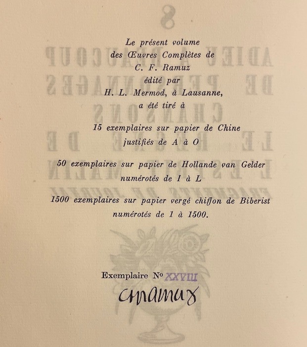 Edition partiellement originale. Un des 50 exemplaires numérotés en romains sur Hollande van Gelder (deuxième papier après 15 Chine). Signé par Ramuz à la justification. En parfaite condition.