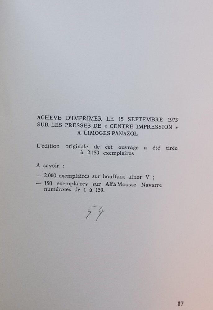 | Lieu d'éd. - Editions - Achevé d'imprime | Sans lieu, Rougerie, 1973. |