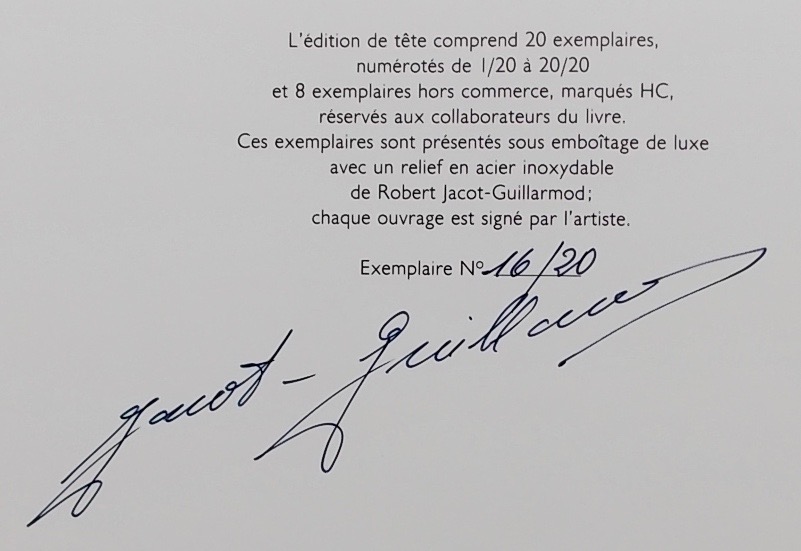 Avec une introduction de Sylvio Acatos et des contributions de Walter Tschopp et Alain Petitpierre. Un des 20 exemplaires de tête signé et justifié par l’artiste et présenté sous emboîtage de luxe avec une relief en acier inoxydable de Robert Jacot-Guillarmod sur le premier plat. A l’état de neuf.