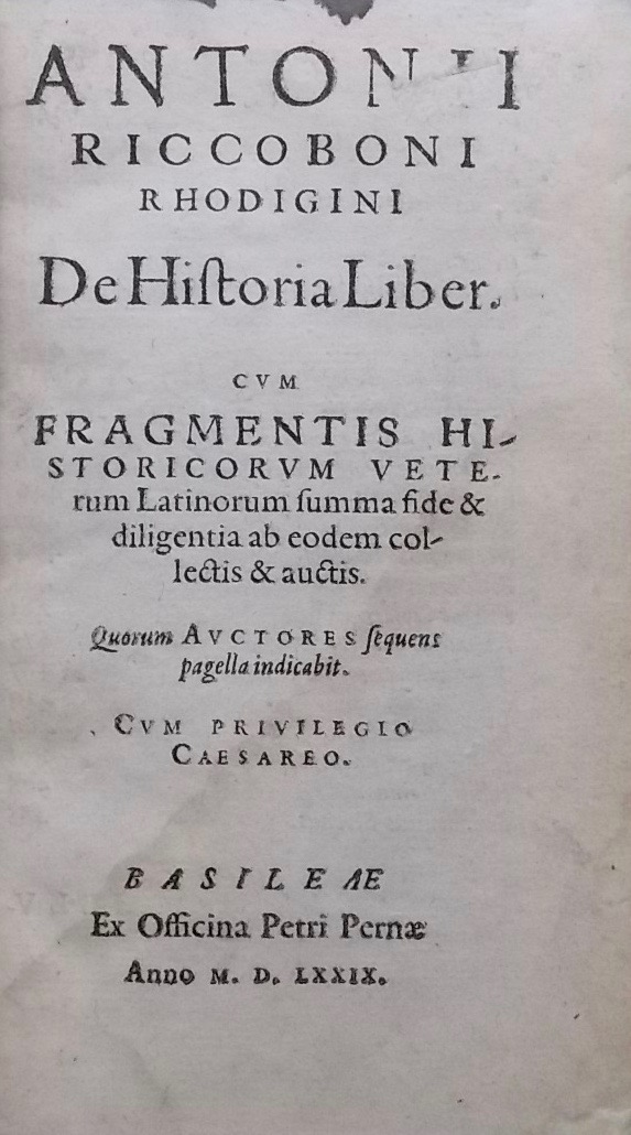 RICCOBONI (Antonio) Antonii Riccoboni rhodigini De Historia Liber. Cum fragmentis historicum veterum Latinorum summa fide & diligentia ab eodem collectis & auctis. Basileae, Ex Officina Petri Pernae, 1579.