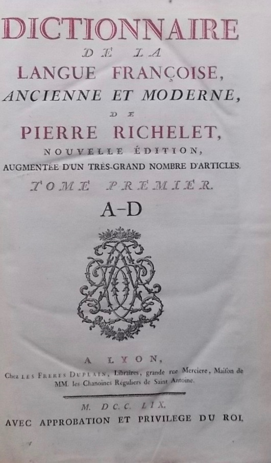 RICHELET (Pierre) Dictionnaire de la Langue Françoise, ancienne et moderne. Nouvelle édition, augmentée d’un très-grand nombre d’articles A Lyon, chez les frères Duplain, 1759.