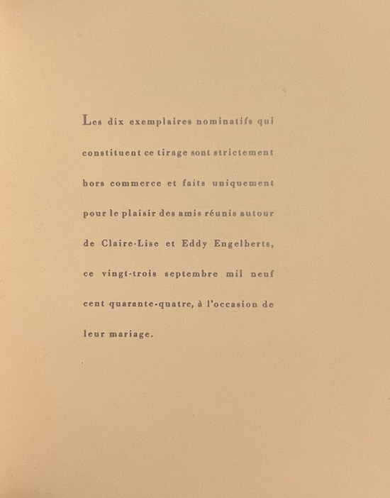 Rarissime plaquette tirée à 10 exemplaires nominatifs et offertes aux amis de Claire-Lise et Eddy Engelberts le 23 septembre 1944, à l’occasion de leur mariage (cet exemplaire était destiné au jardin de Monsieur Blaise de Montmollin). Impression soignée à l’encre argentée sur papier rose. Peut être considéré comme le premier ouvrage édité par Edwin Engelberts.