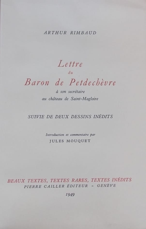 RIMBAUD (Arthur) Lettre du Baron de Petdechèvre à son secrétaire au château de Saint-Magloire. Genève, Pierre Cailler (coll. Beaux textes, textes rares, textes inédits), 1949.