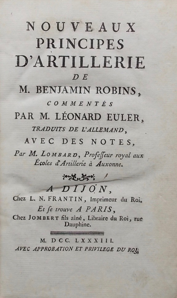 ROBINS (Benjamin) Nouveaux principes d’artillerie, commentés par M. Léonard Euler. Dijon, L. N. Frantin, 1783.