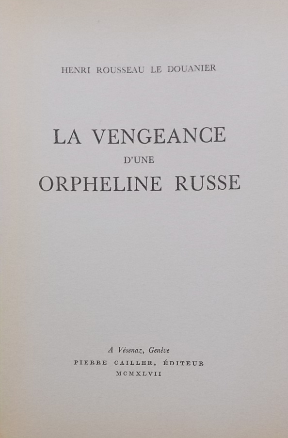 ROUSSEAU (Henri, dit le Douanier) La vengeance d’une orpheline russe. Drame en 5 actes et 19 tableaux. Genève, Pierre Cailler (coll. Ecrits et Documents de Peintres), 1947.