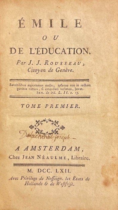 ROUSSEAU (Jean-Jacques) Emile ou de l’éducation. Amsterdam, Jean Néaulme (i.e. Lyon, Jean-Marie Bruyset), 1762.
