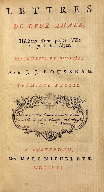 ROUSSEAU (Jean-Jacques) Julie ou La Nouvelle Héloïse – Lettres de deux amans, habitans d’une petite ville au pied des Alpes. A Amsterdam, chez Marc Michel Rey, 1761.