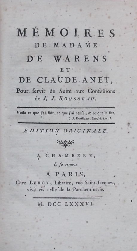 [ROUSSEAU] – [WARENS (Louise Eléonore de la Tour, baronne de)- DOPPET (François-Amédée)] Mémoires de Madame de Warens, suivis de ceux de Claude Anet, Pour servir de suite aux Confessions de J.-J. Rousseau. A Chambéry & se trouve à Paris, chez Leroy, 1786.