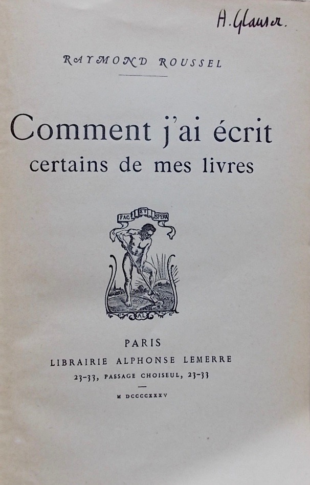 ROUSSEL (Raymond) Comment j’ai écrit certains de mes livres. Paris, Alphonse Lemerre, 1935.