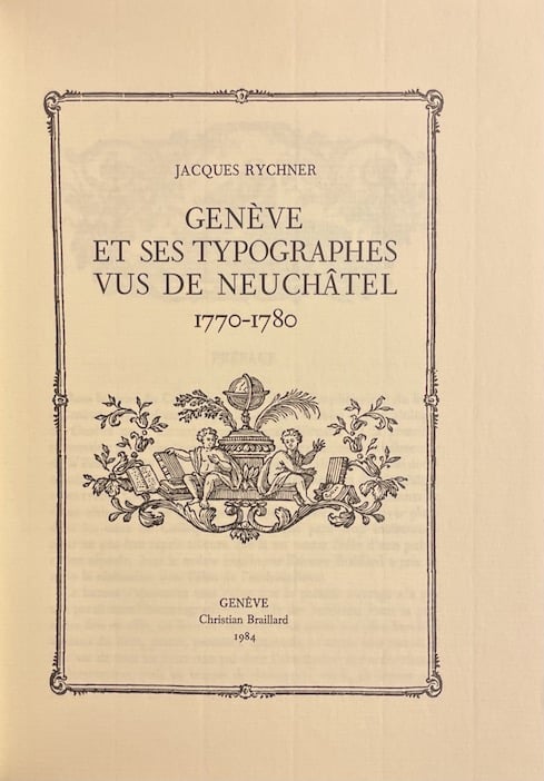 RYCHNER (Jacques) Genève et ses typographes vus de Neuchâtel (1770-1780). Genève, Christian Braillard, 1984.