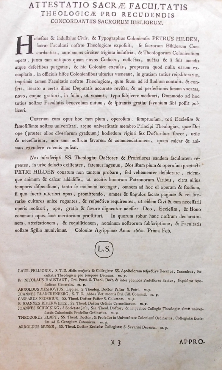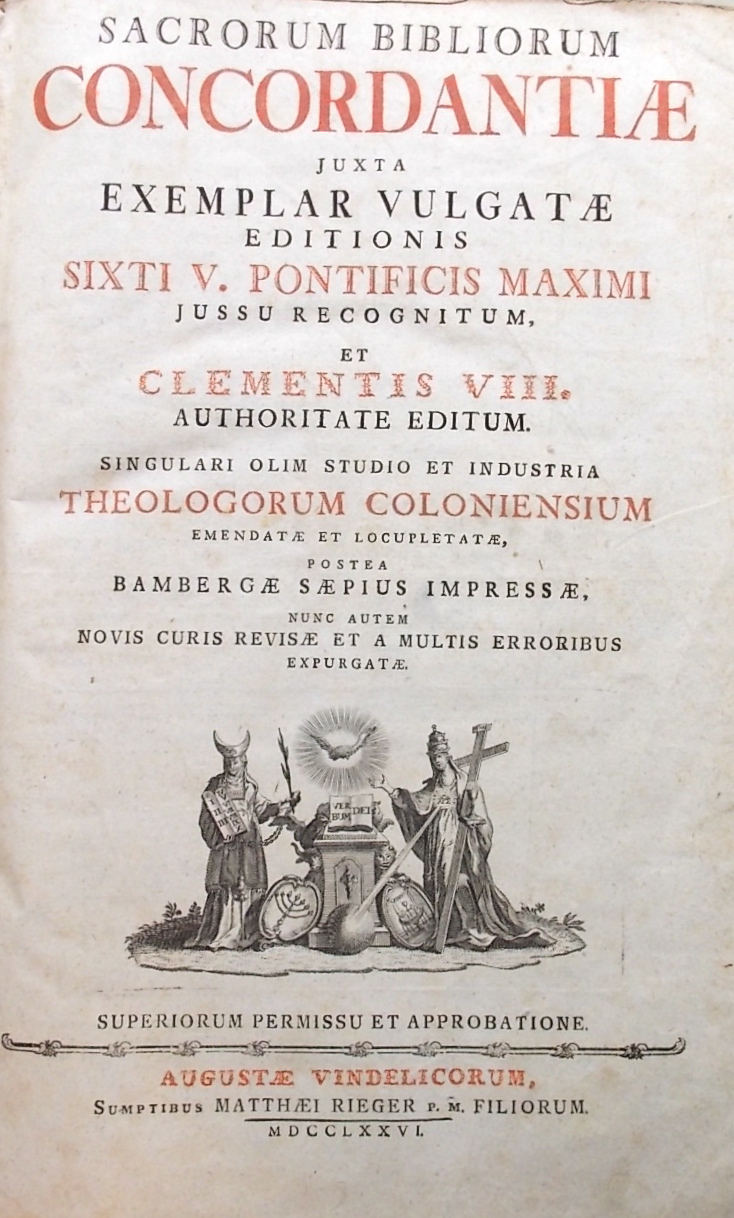 Sacrorum bibliorum concordantiae, Juxta exemplar Vulgatae editionis Sixti V. pontificis maximi Jussu recognitum, et Clementis VIII. authoritate editum. singulari olim studio et industria theologorum Coloniensium emendatae et locupletatae, postea Bambergae saepius impressae, nunc autem novis curis revisae et a multis erroribus expurgatae. Augustae Vindelicorum [Augsburg], Matthaei Rieger, 1776.