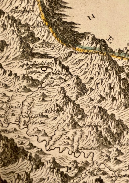 Carte 36 X 45 cm, avec frontières coloriées à la main, montée sur toile. Une carte détaillée et décorative avec deux blasons et une grande scène de montagne fantastique. Elle montre l’emplacement des principales caractéristiques topographiques telles que les villes, les villages, les monastères, les châteaux et les bains. La version en langue allemande fut publiée en 1710. En parfaite condition.
