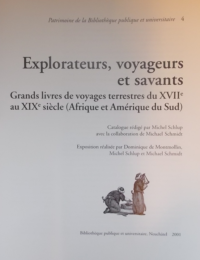 SCHLUP (Michel) Explorateurs, voyageurs et savants à la découverte de l’intérieur des continents (Afrique et amérique du Sud) Neuchâtel, BPU (coll. Patrimoine de la Bibliothèque Publique et Universitaire n° 3), 2001.