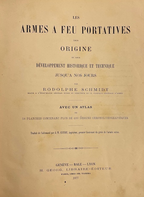 SCHMIDT (Rodolphe) Les armes à feu portatives. Leur origine et leur développement historique et technique jusqu’à nos jours. Bâle – Genève – Lyon, H. Georg, 1877.