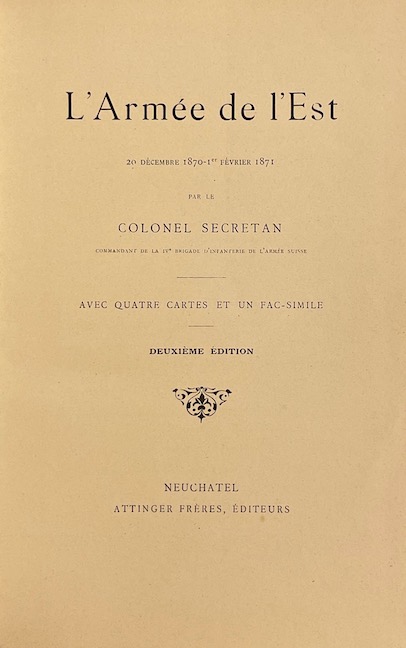 SECRETAN (colonel Edouard) L’Armée de l’Est (20 décembre 1870 – 1er février 1871). Neuchâtel, Attinger Frères, [1894].