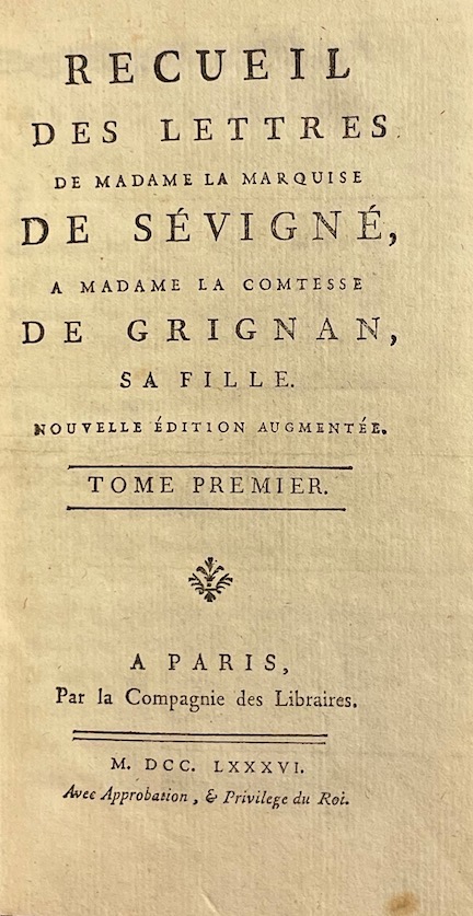 SEVIGNE (Marie de Rabutin Chantal, marquise de) Recueil des lettres de Madame la Marquise de Sévigné à Madame la Comtesse de Grignan, sa fille. Paris, La Compagnie des Libraires, 1786.