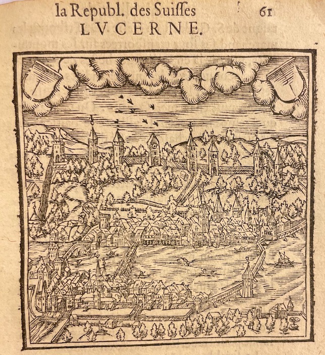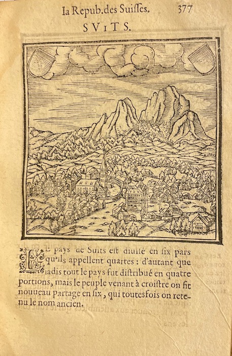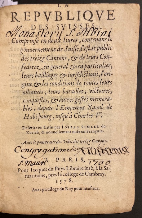 SIMLER (Josias) La république des Suisses. Comprinse en deux livres, contenans le gouvernement de Suisse, l’estat public des treize cantons, & de leurs confederez, en general & en particulier, leurs bailliages & iurisdictions, l’origine & les conditions de toutes leurs alliances, leurs batailles, victoires, conquestes, & autres gestes mémorables, depuis l’empereur Raoul de Habspourg, iusqu’à Charles V. Descrite en latin par Iosias Simler de Zurich &nouvellement mise en François. A Paris, pour Jacques du Puys, 1578.