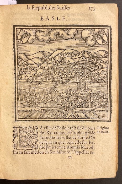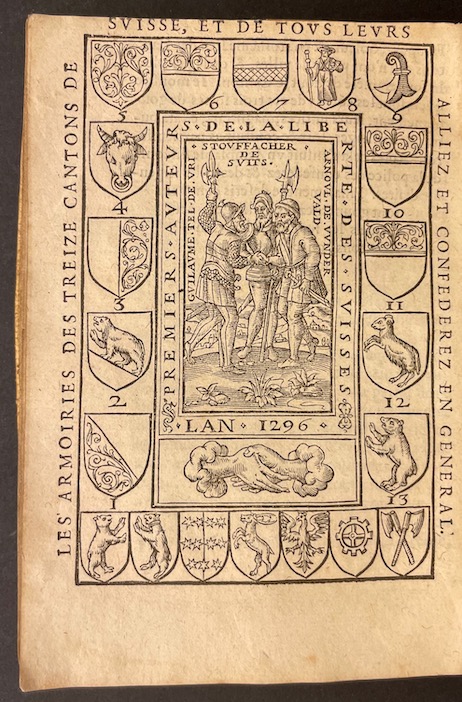 Première édition illustrée de l’ouvrage principal de Josias Simler (1530-1576), sa « Republica Helvetiorum ». Avec une gravure représentant le Serment du Grütli entourée des blasons des 13 cantons suisses et 13 vues gravées sur bois représentant les villes de Lucerne, Zurich, Glaris, Zoug, Berne, Fribourg, Soleure, Bâle, Schaffhouse, Appenzell, Uri, Schwyz, Unterwald. Importante et très rare édition, parue pour la première fois en latin 2 ans auparavant chez Froschauer à Zurich (1576). On suppose qu’il a été traduit par le juriste Innocent Gentillet (mort à Genève vers 1595). Il traite de l’ordre public, politique et social. Dans la première partie, Simler propose une histoire des confédérations, semblable aux chroniques de Stumpf et de Tschudi. La seconde partie est une présentation complète et vivante de la Confédération suisse à son époque. Exemplaire un peu court de marge, particulièrement en tête.