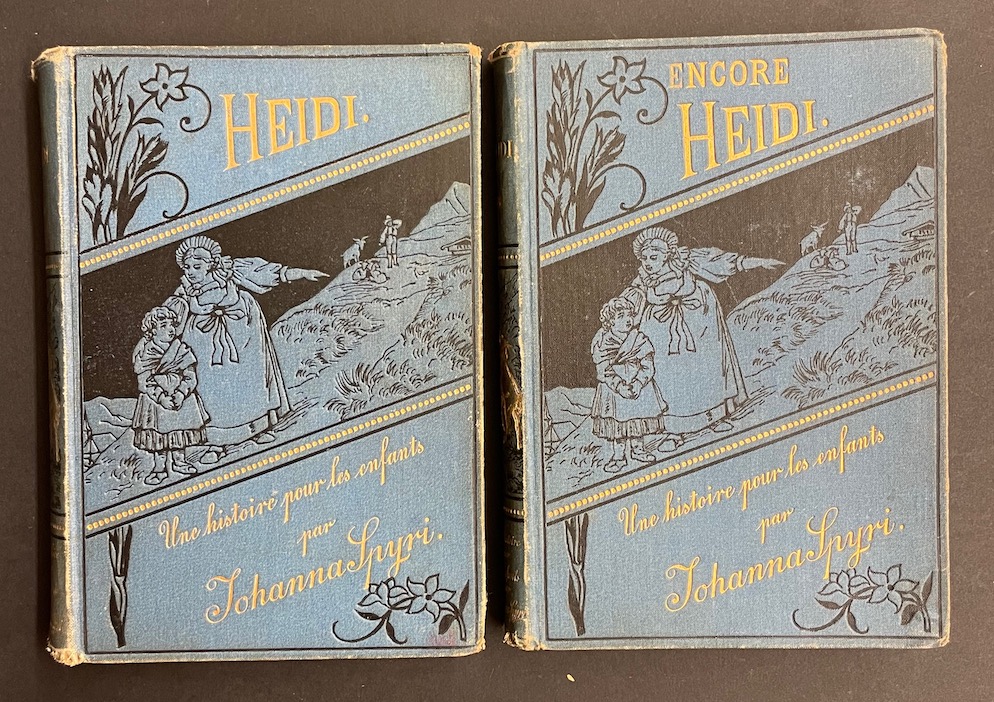 Edition originale pour le second volume (Encore Heidi, 1882), seconde édition illustrée pour le premier volume (Heidi, 1884) de la première traduction française de Camille Vidart. (L’édition originale en langue allemande est parue en 1880). C’est la première traduction du livre suisse qui sera le plus vendu dans le monde et traduit dans plus de 70 langues. Illustré de 6 planches hors texte en noir. Quelques traces d’usage aux reliures, sinon en très belle condition.