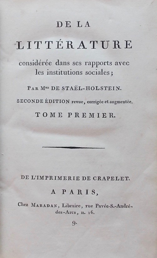 STAEL-HOLSTEIN (Germaine, Madame de) De la littérature considérée dans ses rapports avec les institutions sociales. Paris, Maradan, An 9 [1801].