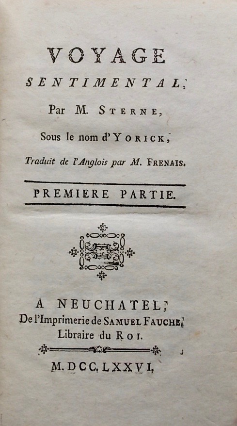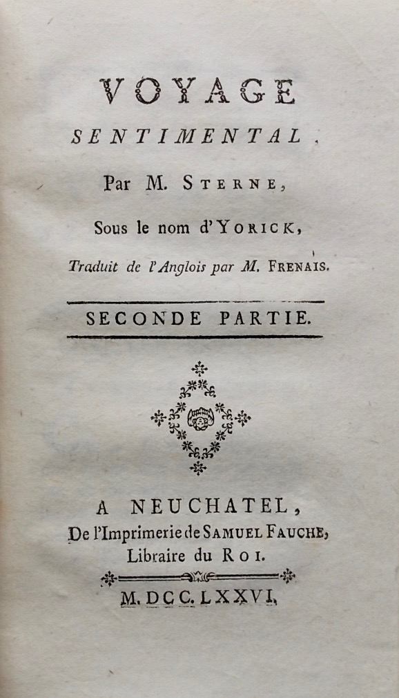 STERNE (Laurence) Voyage sentimental, par M. Sterne, sous le nom d’Yorick, traduit de l’anglais par M. Frenais. Neuchâtel, Samuel Fauche, 1776.
