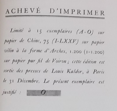 Edition originale numérotée. Un des quinze exemplaires de tête sur Chine lettrés de A à O. Typographie soignée. De la plus grande rareté sur ce papier, bien évidemment.