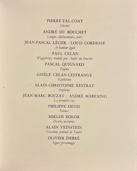 Elégante revue rassemblant des textes de André Du Bouchet, Jean-Pascal Léger, Paul Celan, Pascal Quignard, Alain-Christophe Restrat, Jean-Marc Bouzat, Philippe Denis et Alain Veinstein. Des dessins de Pierre Tal-Coat, Louis Cordesse, Gisèle Celan-lestrange, André Marfaing, Miklos Bokor et Olivier Debré. Un des 50 exemplaires de tête accompagnés d’une pointe-sèche originale signée de Pierre Tal-Coat. En parfaite condition.